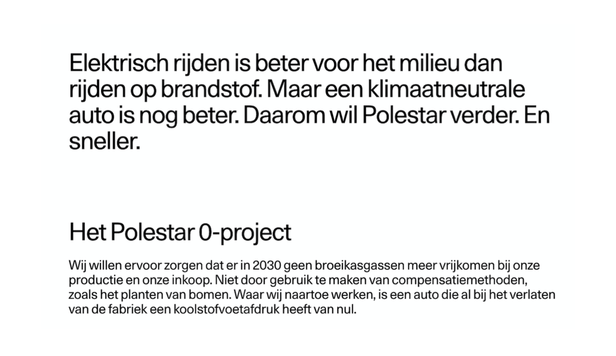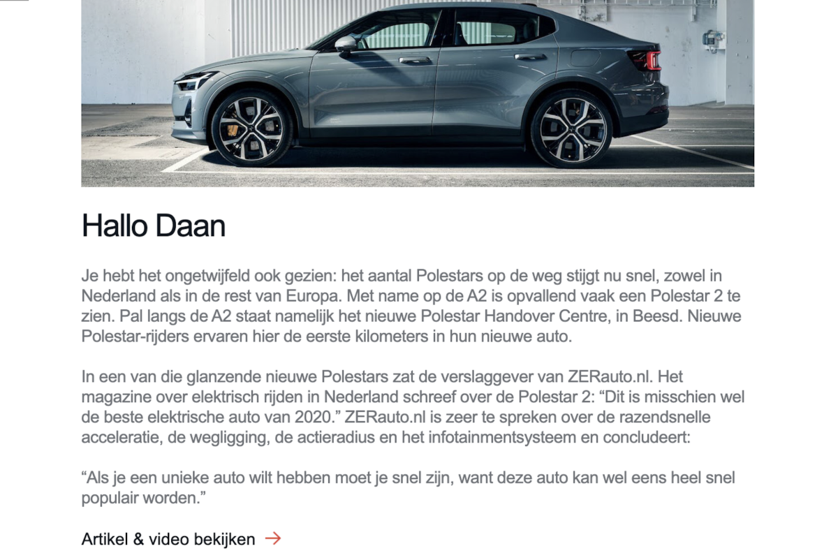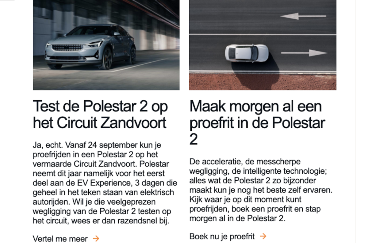 Bijna 2 jaar lang was ik de vaste copywriter voor Polestar Nederland, via Code d’Azur. Ik schreef copy voor de website, nieuwsbrieven, artikelen en vele customer journey mails. Allemaal met de strakke, minimalistische Polestar tone of voice.