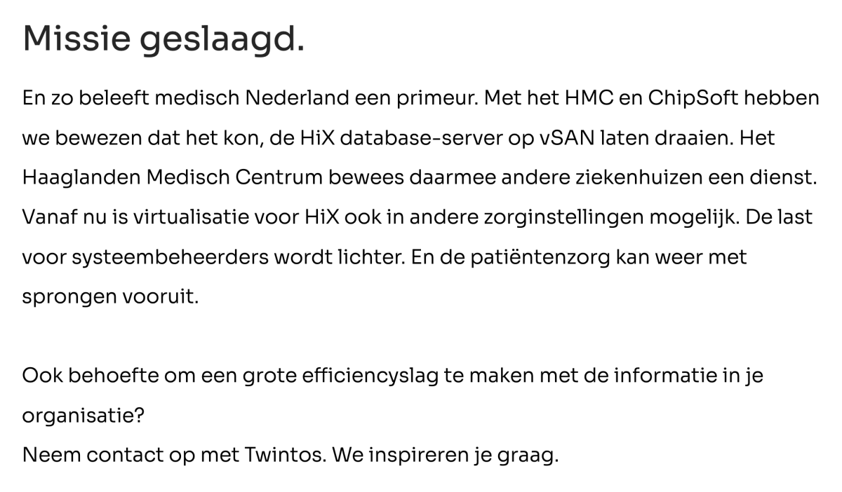 Al 2 jaar ben ik vaste copywriter voor Twintos. Ik ontwikkelde de tone of voice, stuur de communicatiestrategie mee aan en schrijf alle copy. Ik merkte dat Twintos elk project aangaat alsof het een actiefilm is; dat aspect heb ik ook in de toon verwerkt.